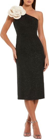 Sleek bouclé midi dress featuring a one-shoulder neckline and bold 3D flower accent for a striking, fashion-forward look.