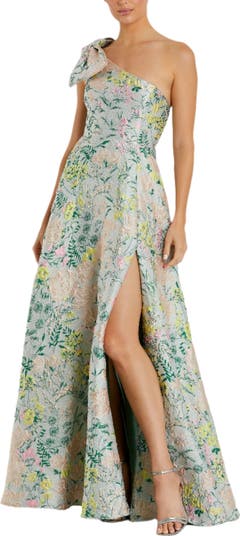 Elegant one-shoulder brocade gown with a chic bow detail, perfect for formal events and adding a touch of sophistication.