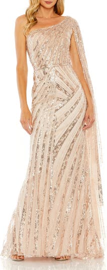 Elegant one-shoulder gown with flowing cape sleeve and delicate embellishments—perfect for making a sophisticated statement.