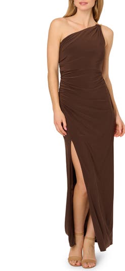 This simply stunning gown in a curve-skimming column silhouette shaped from the label's slinky jersey goes for a minimalist aesthetic save for a golden rope chain highlighting the single shoulder.