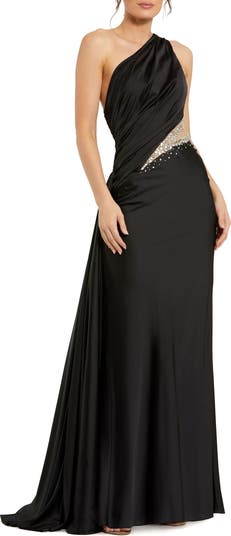 One Shoulder Charmeuse Gown With Beaded Cutout