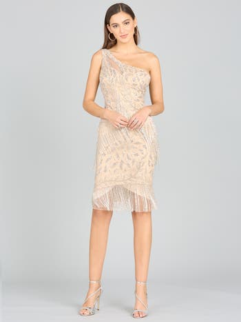 This beaded midi, knee length dress features a fitted skirt to accentuate your curves.