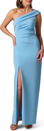 Rippled ruching enhances the texture and shape of this embellished one-shoulder crepe gown designed with a leg-baring slit.