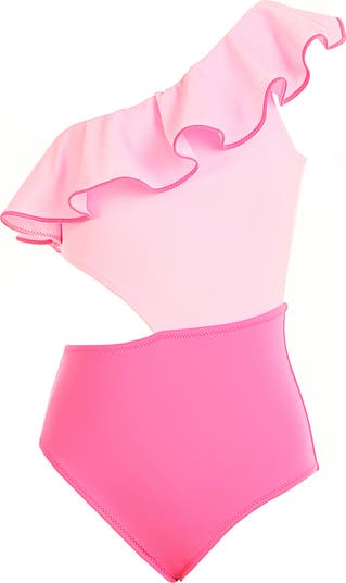 This striking maillot features a fresh two-tone pink palette, with a soft pastel top flowing into a vibrant fuchsia base. The asymmetric one-shoulder neckline is defined by a voluminous flounce ruffle with a sharp contrast pink edge, while a bold side cutout adds a trendy, high-fashion finish.