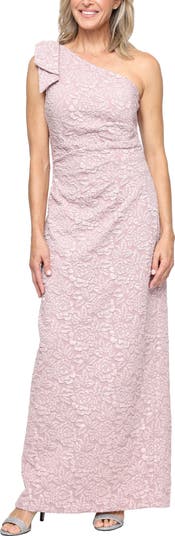 A one-shoulder column gown blooms in floral-embossed stretch crepe, crowned with a sculptural bow at the shoulder for romantic drama. Asymmetric ruching through the bodice shapes the sleek silhouette, while a back slit adds graceful movement to this elegant style.