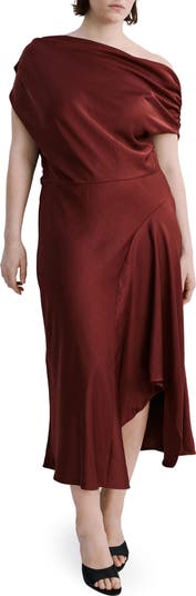 Elegant and fluid, this satin midi dress is designed with a one-shoulder neckline and a softly draped bodice that enhances its sculpted shape. A paneled high-low skirt skims the body with graceful movement, creating a modern, polished silhouette that's perfect for cocktail hours and evening events.