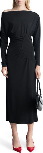 Make a striking impression in this long-sleeve midi dress fashioned in a one-shoulder silhouette framed by asymmetric ruching.