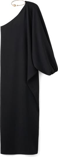 Golden hardware elevates this elegant shoulder-showing maxi made with a single billowed sleeve and cut in a drapey silhouette.