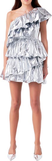 Go crazy for chrome and don't stay home in this metallic minidress featuring a tiered-ruffle skirt and frilly one-shoulder neck.