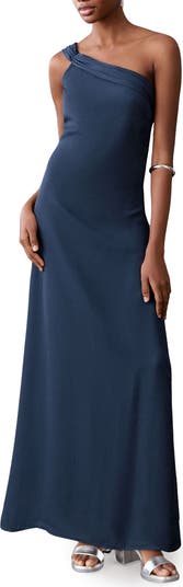 A drapey one-shoulder neckline keads to a flowy sash on this elegant dress cast in a moody navy blue and perfect for your next soirée.