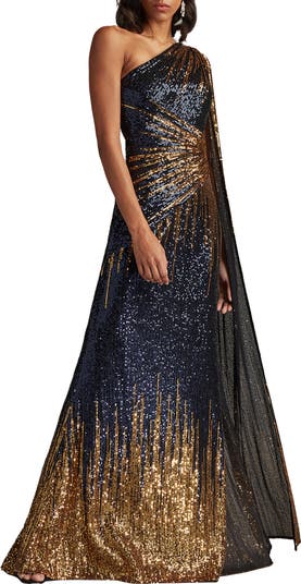 Deliver dazzling drama in a sequin-set gown that exposes one shoulder and drapes the other in a flourishing, cape-like sleeve.