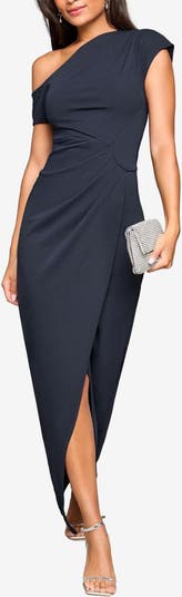 Sleek satin drapes effortlessly across this one-shoulder cocktail dress shaped with soft gathers and finished with an alluring side slit.