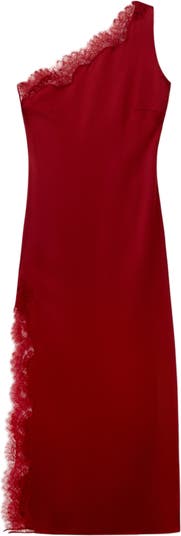 Elegant and fluid, this one-shoulder satin cocktail dress is designed with an asymmetrical neckline and softly draped silhouette. Eyelash lace traces the bodice and accents the side slit for a touch of delicate texture, while an attached scarf falls from the shoulder, offering graceful movement and versatile styling.