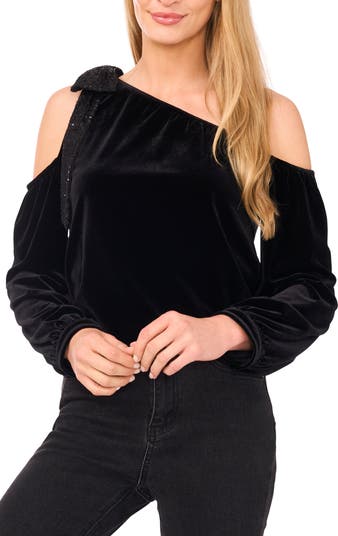 A dazzling sequin bow punctuates the cold-one-shoulder neckline of this long-sleeve top made from rich velvet.