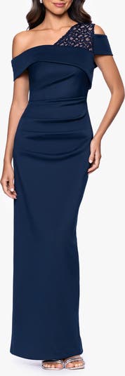 Shimmering crystals highlight the lacy mesh and asymmetric neckline of this ruched sheath dress.