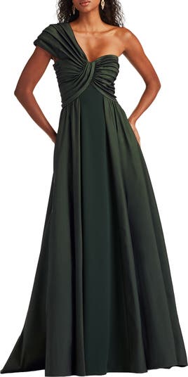 Soft pleats and expert folding define the striking one-shoulder silhouette of a swishy taffeta gown that will get glasses raised.