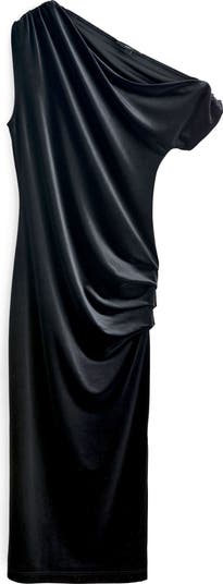 Languid and alluring, this one-shoulder dress is cut from drapey stretch velvet that skims the body with soft shirring for an elegant, sculpted effect. A single short sleeve adds balance to the asymmetrical neckline, while the straight skirt keeps the silhouette sleek from top to hem.