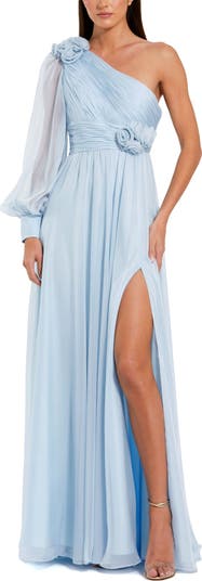 Exude elegance in this chiffon gown, featuring a thigh-high slit and delicate 3D flower detail for a feminine touch. Perfect for any special occasion.