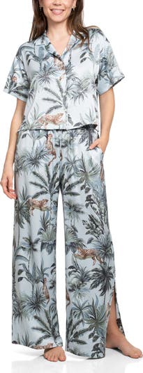 Designed for unhurried nights and brighter mornings, this satin pajama set balances ease and drama in one sweep. A boxy button-up top and wide-leg pants with slits at the hems set the flow, then a lavish print turns the whole thing into wearable daydreaming.