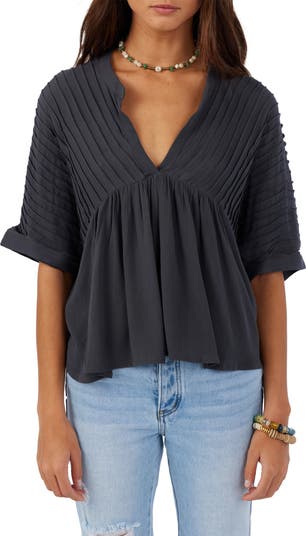 Pintuck pleats lead to a drapey hem on this breezy, lightweight top framed by slouchy elbow-length sleeves.