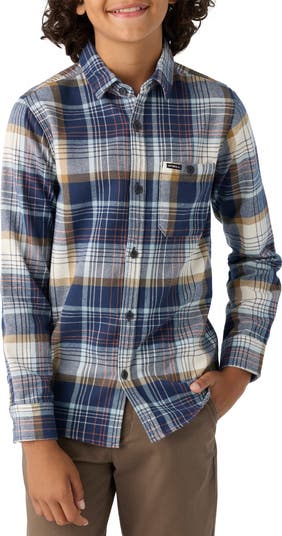 Classic and comfortable, this shirt made of cotton flannel sports a colorful plaid pattern and a kid-size fit that layers easily in the cold.
