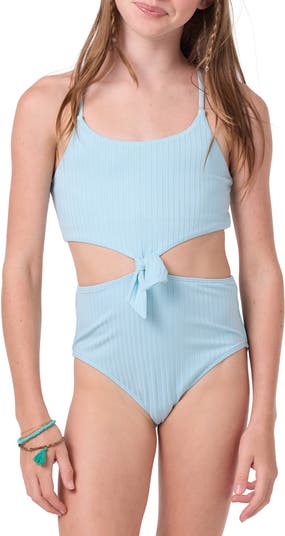 The fun is in the details of this one-piece swimsuit that features a knotted cutout that your junior beach lover will approve of.
