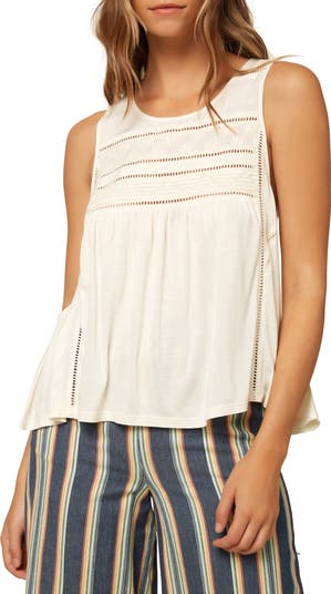 Feel the breeze in this airy knit tank styled with a ladder-stitched yoke, fanciful embroidery and a flowy fit.