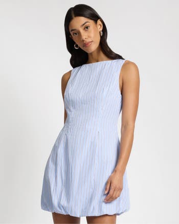 The Boatneck Bubble Mini Dress is cut with a clean, sculpted silhouette that balances a fitted bodice with a softly rounded bubble hem. The boat neckline frames the shoulders while the mini length keeps the proportion modern and light. Structured yet easy, the shape holds its volume while maintaining a streamlined fit through the waist.