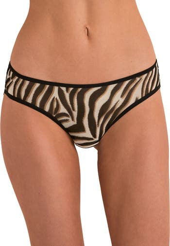 These cheeky sheer-fabric animal print panties feature a wild printed mesh front and a black lace back for a playful twist. (Available in sizes XS-XL.)