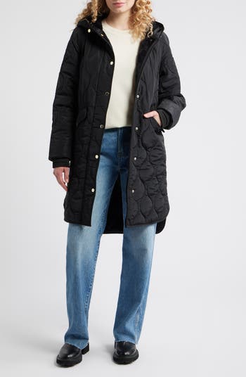 Onion quilting brings eye-catching texture to this long coat featuring thumbhole knit cuffs and a roomy hood to keep warmth in and cold out.