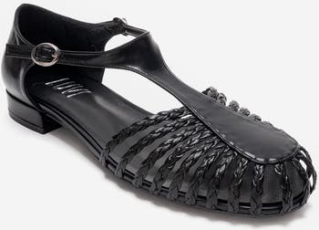 A sophisticated T-strap sandal with woven detailing and an adjustable ankle strap for a refined fit