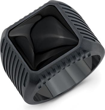 Milled with care and precision in Black Titanium this Onyx Block Ring also offers the midnight black sheen of polished Onyx-this smooth surface of this stone provides a beautiful contrast between itself and the sandblasted satin finish to its Black Titani