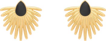 A teardrop of inky onyx crowns a fan of engraved and polished rays to create 18-karat gold-plated, deco-inspired earrings that read retro yet strikingly modern.