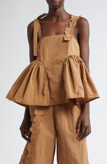 The Danish designer's flair for frills teams up with utilitarian elements in this nylon-ripstop top steeped in romantic signatures—a dainty bow strap and cascading, laser-cut flora that give way to dramatic ruffle hem.