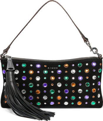 A swingy tassel and colorful jewel embellishments highlight the slender profile of a party-ready clutch shaped from supple suede and featuring a convertible wrist strap for convenient carry.