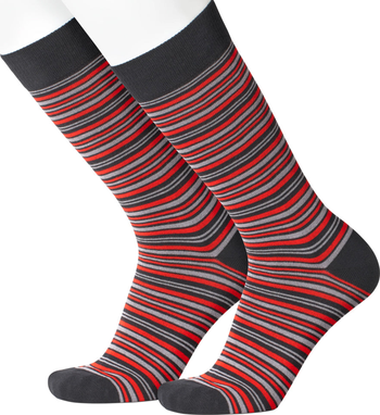 - Repeating stripes of red, black, orange and grey are topped and toed in black