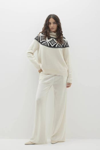 The Oona Turtleneck Sweater features an intricate hand-crochet pattern and ribbed trim, blending texture and elegance in a warm, fashion-forward cashmere knit.
