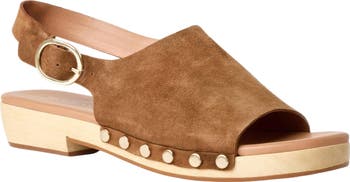 This slingback sandal made from soft suede with round studs that shine is finished with a wood midsole for retro influence.