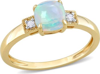 Adorn your hand with the magical iridescence and sophisticated contrast of this opal and diamond accent ring. Crafted in rich 10k yellow gold, the ring features a magnificent cushion-cut blue opal at its center, showcasing captivating flashes of color. The warm gold beautifully complements the opal's cool, shifting hues, while delicate diamond accents on the band add a touch of brilliant sparkle. This piece is a truly unique and luxurious statement, blending the ethereal beauty of the opal with classic elegance.