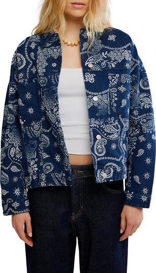 This slouchy, nonstretch jean jacket is designed in a flowery print with an inverted back pleat.