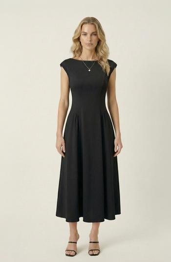 This midi dress is crafted in a smooth, structured fabric that holds its sculpted silhouette with effortless elegance. A clean, high neckline and subtle cap sleeves create a refined front, while a dramatic open back adds modern contrast and allure. The fitted bodice flows into a softly gathered skirt for graceful volume and movement. Style it with sleek heels and minimal jewelry for evening or layer with a tailored blazer for a polished, contemporary look.