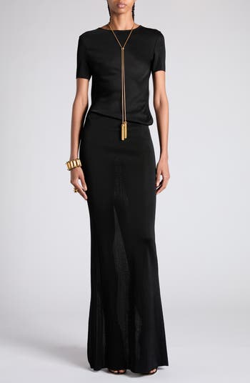 Peter Hawkings upholds Tom Ford's sultry aesthetic with the chain-secured open back and soaring slit of this slink short-sleeve dress sewn from a structured double knit.