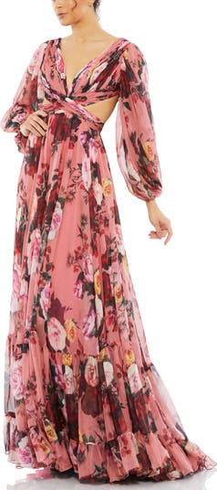 Chiffon long sleeve dress with V-neck, lace-up back, side cut-outs & lined bodice—lightweight, stylish & perfect for standout special occasions.