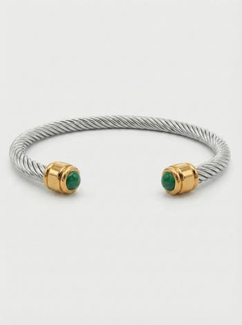 A sculpted cable cuff bracelet designed with a refined open silhouette for a modern, polished look. Measuring approximately 7.48 inches in length with an inner diameter of 2.44 inches, this 18K gold plated, two-tone style is crafted from stainless steel and designed for comfortable everyday wear.