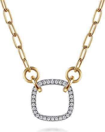 An open diamond cushion-shaped pendant illuminates an airy paper-clip chain necklace cast in polished 14-karat gold.