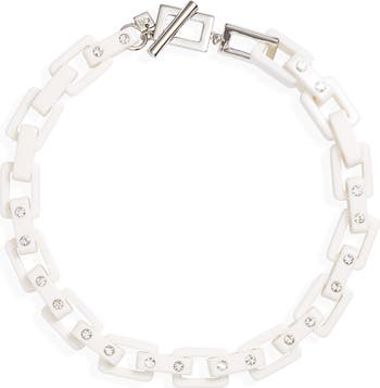 Show off eye-catching shine in this trendy collar necklace featuring chunky resin links adorned in sparkly crystals, and a gleaming toggle closure.