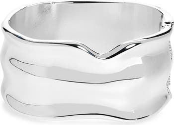 A molten, fluid design catches the light on a wide hinged cuff bracelet crafted from recycled metal with a high-shine finish.