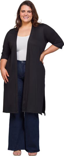 Layer in style with this plus size duster cardigan from 24seven Comfort Apparel. Designed with an open front elbow length sleeves and subtle side slits this lightweight piece offers both comfort and versatility. The knee length silhouette adds polish to any outfit making it perfect for layering over dresses tops or tanks. Whether for the office or weekend wear this cardigan adds the perfect finishing touch. Available in multiple color options.