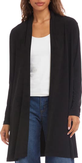 Wrinkle-resistant jersey fabric brings a travel-friendly look to this open-front cardigan designed with a versatile side slit that can be worn open or zipped.