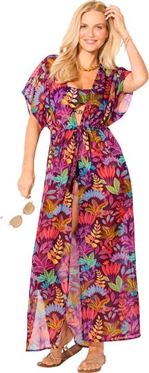 Airy and effortlessly elegant, this light chiffon maxi cover up brings easy style to your swim look. A deep V-neckline with an open front creates a breezy, relaxed silhouette, while an adjustable self-tie waist lets you define your shape. Flowing dolman sleeves and long side slits add graceful movement, making it the perfect layer for poolside lounging or sunset strolls.
